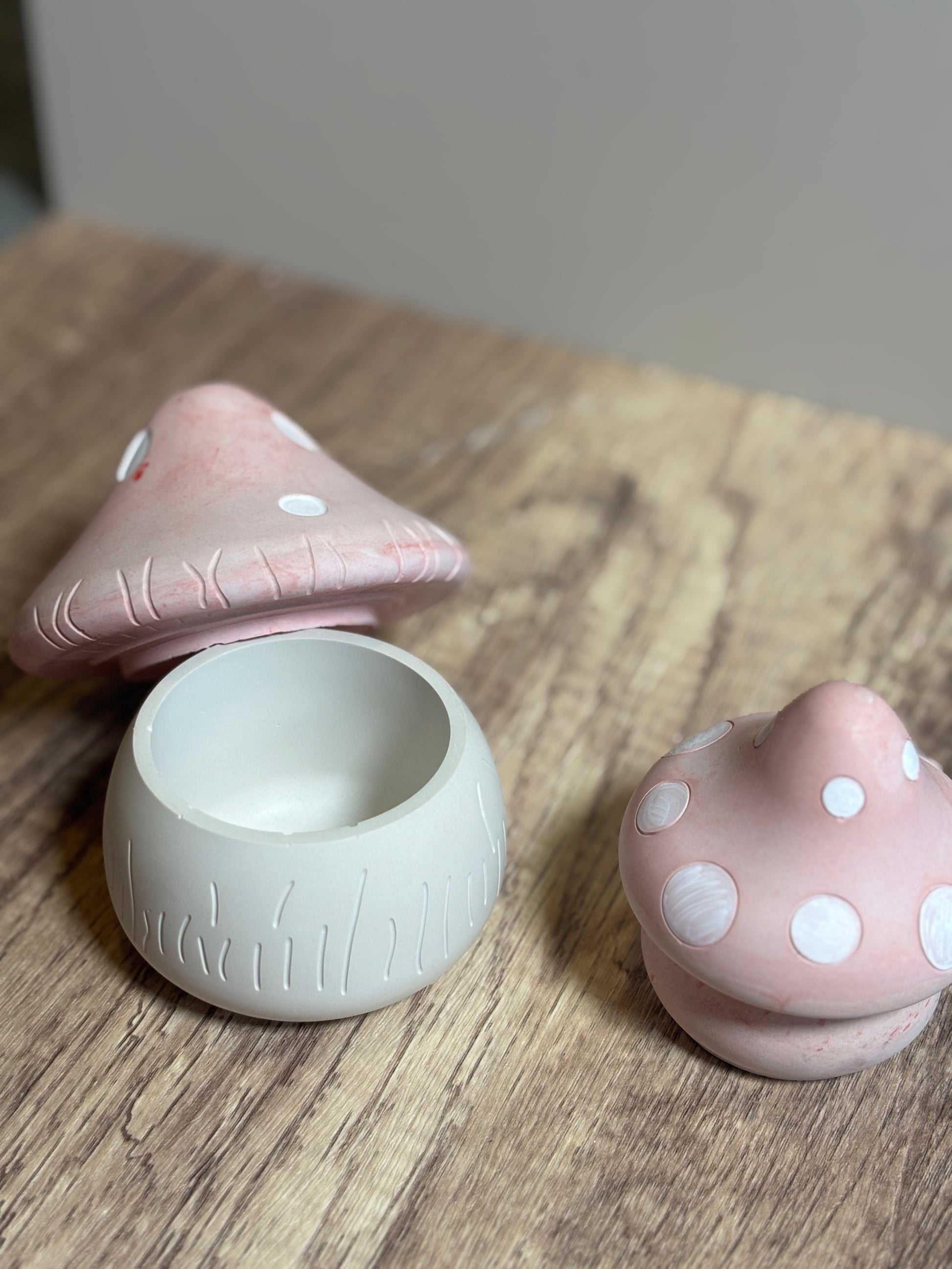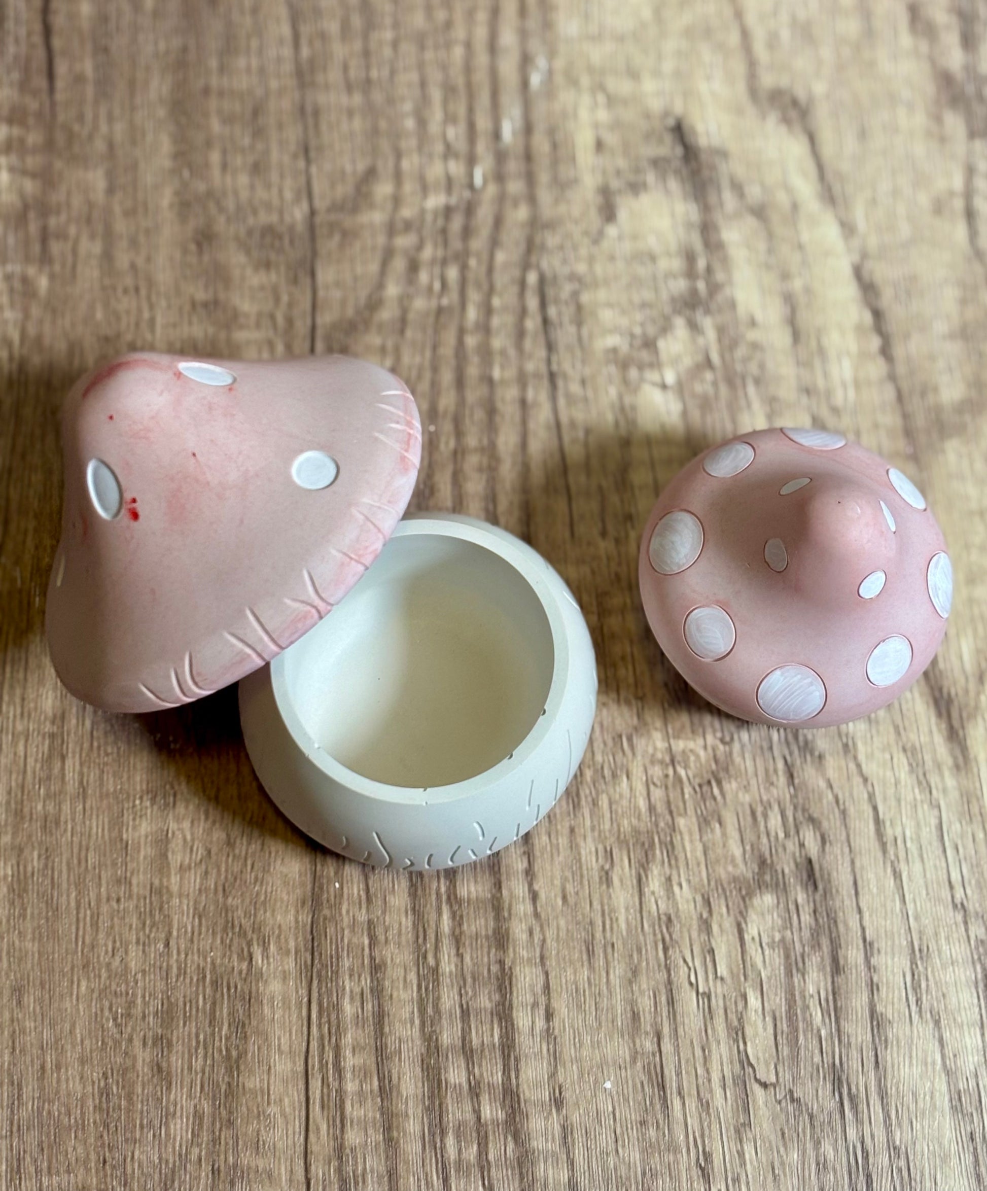Bring a touch of woodland charm to your home with our handcrafted Pink Mushroom Jar & Figurine Set. Made from eco-friendly resin, this playful duo includes a lidded mushroom jar—perfect for holding jewelry, trinkets, or small keepsakes—and a matching mushroom figurine to display alongside it.